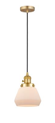 This 1 light Mini Pendant from the Franklin Restoration Fulton collection by Innovations Lighting will enhance your home with a perfect mix of form and function. The features include a Satin Gold finish applied by experts. Product Features Include: Brand: Innovations Lighting, Collection: Franklin Restoration Fulton, SKU: 201CSW-SG-G171, UPC: 745684621843, Category: Mini Pendant, Finish: Satin Gold, Glass: Matte White Cased Fulton, Material: Steel/Cast Brass/Glass, Designer: Bruno Marashlian, Width: 7.00 in., Height: 10.00 in., Max Height: 130.50 in., Diameter: 7.00 in., Backplate/Canopy Width: 4.50 in., Backplate/Canopy Length: 0.00 in., Backplate/Canopy Thickness: 0.75 in., Weight: 3.00 lb., Included Chain/Rods/Cord: 10 Feet Of Black Textured Cord, Switch: On/Off Turn Switch, Warranty: 2 Year Finish, Lifetime Electrical, Bulbs Included: No, Bulb Category: Incandescent, Primary Bulb(s): 1 x 60.00 watts Medium Base ST64 Vintage, Color Temperature: 2200K, Color Rendering Index: 99.9000, Total Lumens: 220, Voltage: 120, Safety Rating: UL/ETL Damp