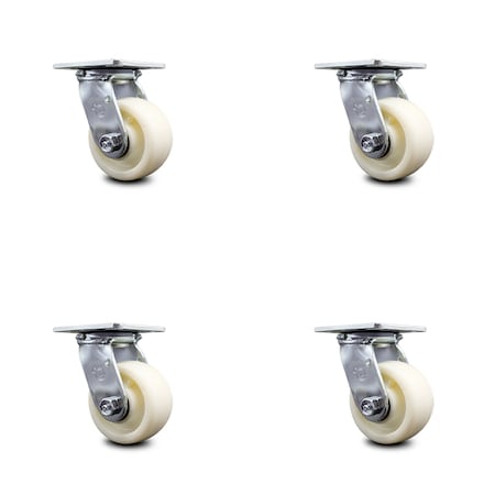 Listing is for a set of four (4) Service Caster Series #30 swivel casters with 4" diameter by 2" wide nylon wheel and maintenance free precision ball wheel bearings capable of supporting a total weight of 3,200 lbs. (800 lbs. per caster). When searching for a reliable and durable heavy duty solution to your caster needs, consider Service Caster’s Series 30 nylon wheel casters.The Service Caster Series #30 is ideal for medium and heavy duty material handling, carts, equipment, and shop projects. The zinc plated finish provides durability under any condition and the nylon wheels provide very low rolling resistance, show a high resistance to many aggressive substances and under normal operating conditions are maintenance free. Resistant to most chemical and oils, these nylon wheels will keep you safely moving forward. Service Caster is unsurpassed in quality, reliability, and excellent customer service. Count on us to move you forward.