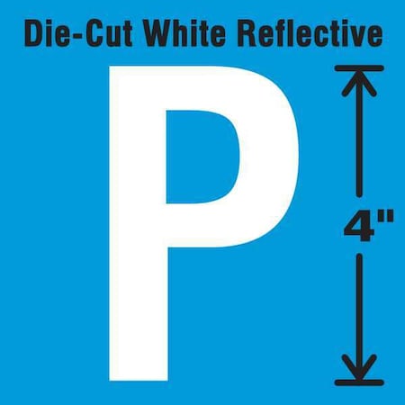 'Reflective Letter Label, Character P, Character Height 4 In., Character Width 2-1/4 In., Color Reflective White, Material Vinyl, Overall Height 4 In., Overall Width 2-1/4 In., Package Quantity 5'