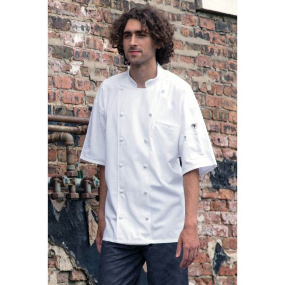 65/35 poly/cotton fine line twill - 5.3 oz. Feel cool under fire. This short sleeve chef coat with revolutionary moisture-wicking mesh back will have you moving with ease and feeling comfortable for your entire shift. 12 matching Cloth-covered buttons, moisture-wicking mesh back, inset pocket, thermometer pocket, finished collar, reinforced bar tacking, reversible closure. Color: White. Size: Xsmall.