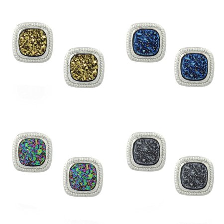 Brilliant cushion-cut druzy stones feature a mystic array of color that flashes a multitude of different hues in the sunlight, are set in these finely crafted sterling silver stud earrings. These highly polished earrings are available in your choice of gold, silver, Cassiopeia blue, and multi. <br /> <br /> <ul> <li>Style: Stud</li> <li>Color: Gold, silver, blue, multi </li> <li>Stone: Druzy</li> <li>Stone measurements: 8.3 mm wide x 8.3 mm long</li> <li>Metal: Sterling silver</li> <li>Finish: High polish</li> <li>Clasp: Butterfly</li> <li>Metal weight: 3.1 grams</li> <li>Earring dimensions: 13 mm wide x 13 mm long</li> </ul> <br /> <b><i>Treatment code E (Druzy). See <a href="http://www.overstock.com/cgi-bin/d2.cgi?PAGE=staticpage&page_id=2200" target="_blank"><span class="links">Gemstone Treatments</span></a> for further information.</i></b> <br />