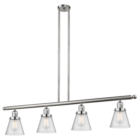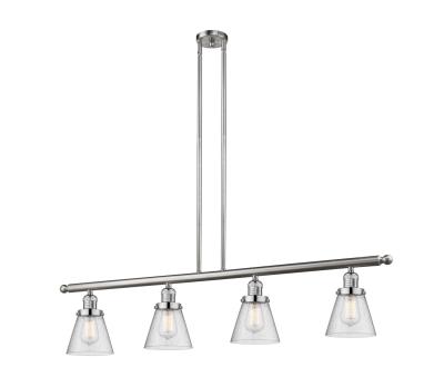 INNOVATIONS LIGHTING 214-SN-G64 Small Cone 4 Light Island Light part of the Franklin Restoration Collection. The Small Cone 4 Light Island Light is part of the Franklin Restoration Collection. Includes 2-6 and 4-12 inch Stems. Additional Stems sold separately. Solid Brass 180 Degree Adjustable Swivels with internal teeth that lock in at 5 degree intervals With Engraved Cast Cup. Solid Brass 90 Degree Hang Straight Swivel for Sloped Ceilings Included. Collection: Franklin Restoration. Material: Steel, Cast Brass, Glass. Metal Finish(Body): Brushed Satin Nickel. Metal Finish(Canopy/Backplate): Brushed Satin Nickel. Dimension(in): 50.875(W) x 10(H) x 6.25(Ext). Minimum Height (Fixture Height with Shade, Cord or Included Stems & Canopy)(in): 20. Max Height (Fixture Height with Cord or Included Stems & Canopy)(in): 44. Wire/Cord: 10 Feet Of Wire. Bulb: (4)100 Medium Base Vintage Bulb recommended(Not Included). Voltage: 120. Glass: Seedy Small Cone/Seeded. Shade Shape: Cone. Shade Material: Glass. Shade Size(in): 6.25 X 5.75. Shade Fitter Measurement: 3.25 inch Fitter. Canopy Dimension(in): 4.5 x 0.75. Solid Brass 180 Degree Adjustable Swivels with internal teeth that lock in at 5 degree intervals With Engraved Cast Cup. Solid Brass 90 Degree Hang Straight Swivel for Sloped Ceilings Included. UL/CUL Damp Rated. Warranty: 2 Year Finish, Lifetime Electrical.