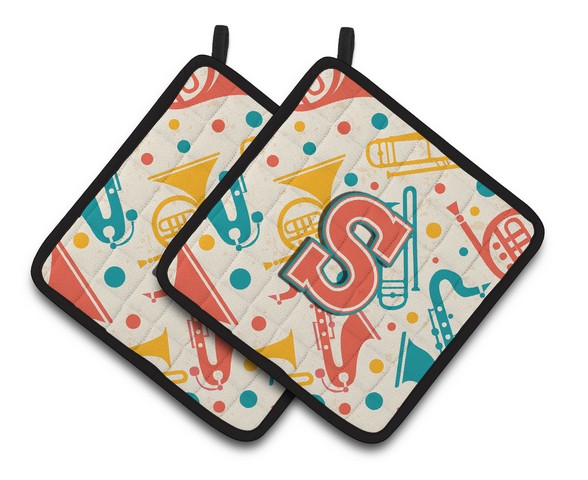 Carolines Treasures CJ2001-SPTHD Letter S Retro Teal Orange Musical Instruments Initial Pair of Pot Holders, 7.5 x 3