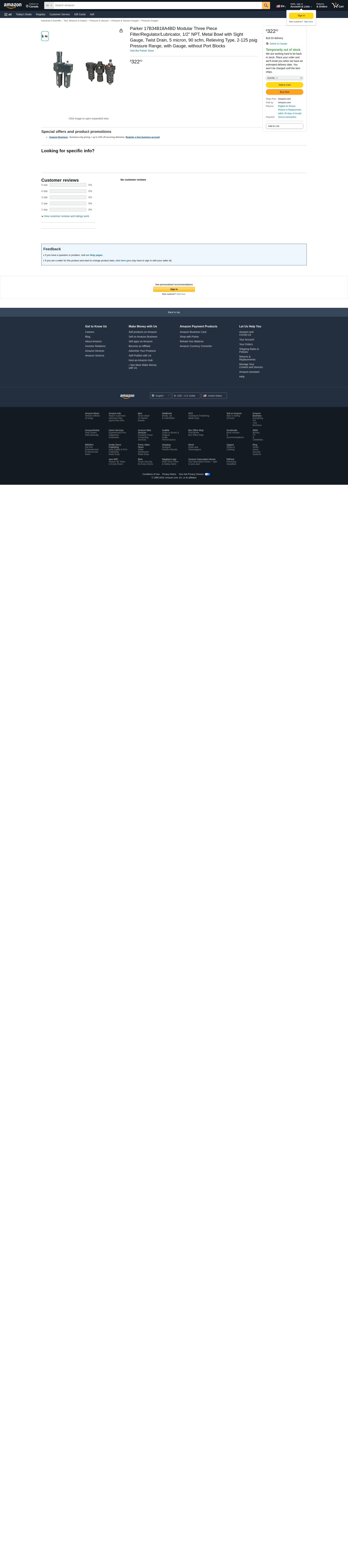 Parker 17B34B18A4BD Modular Three Piece Filter/Regulator/Lubricator, 1/2" NPT, Metal Bowl with Sight Gauge, Twist Drain, 5 micron, 90 scfm, Relieving Type, 2-125 psig Pressure Range, with Gauge, without Port Blocks
