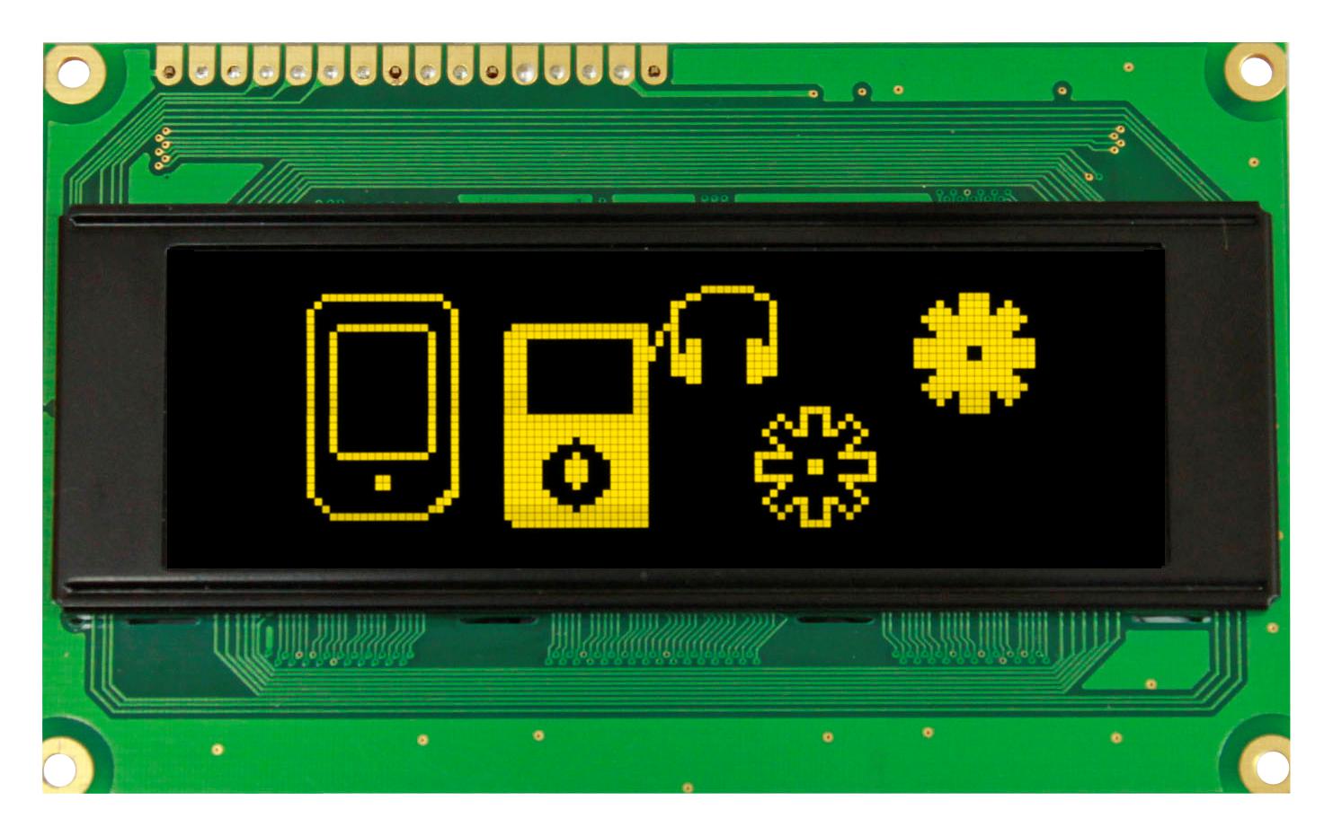 - <b>Price For:</b> Each <b>Resolution</b>: 100 x 32 Pixels <b>Display Appearance</b>: Yellow on Black <b>Logic Voltage</b>: 5V <b>Interface Type</b>: Parallel, SPI <b>Module Size</b>: 98mm x 60mm <b>Operating Temperature Min</b>: -40°C <b>Operating Temperature Max</b>: 80°C <b>Display Construction</b>: COB <b>Product Range</b>: OLED-100H032B Series <b>RoHS Phthalates Compliant</b>: Yes