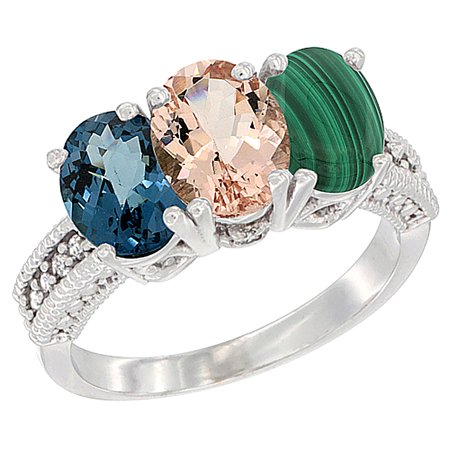 14K White Gold Natural London Blue Topaz, Morganite & Malachite Ring 3-Stone 7x5 mm Oval Diamond Accent, sizes 5 - 10