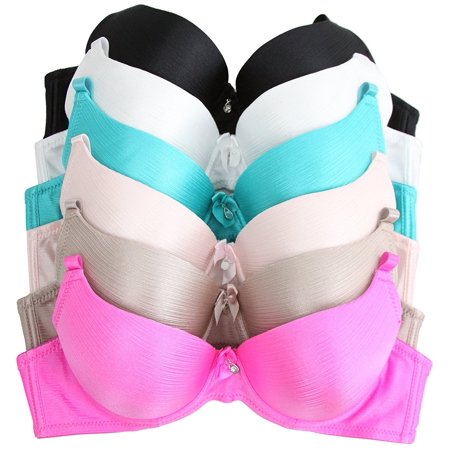 <ul> <li>10% spandex</li> <li>Hook and Eye closure</li> <li>Unlined, plain pattern, satin fabric, unlined, full-cup</li> <li>Sizes: 32B, 34B, 34C, 36B, 36C, 38B, 38C, 40C</li> <li>Materials: 90% Nylon, 10% Spandex</li> <li>Assorted Colors: Black, Hot Pink, Light Pink, Mauve, Teal, and White</li> </ul>