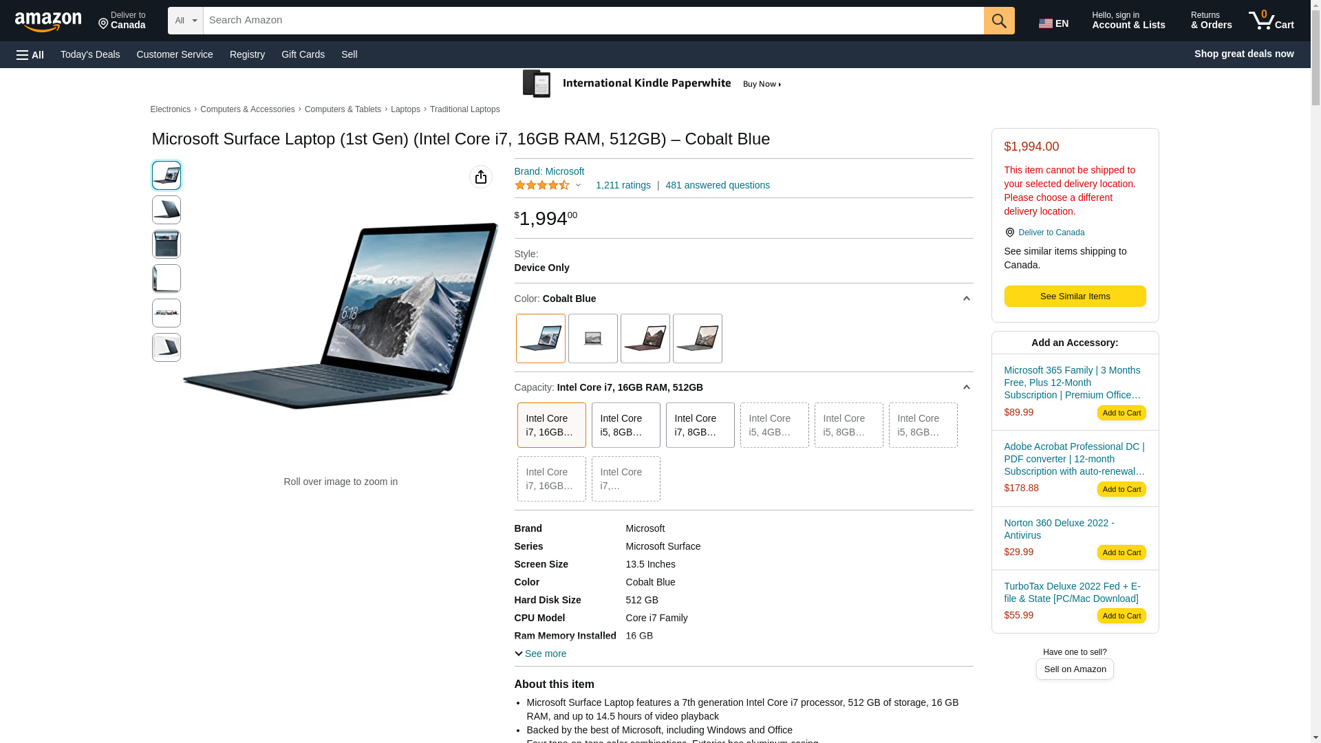 Microsoft Surface Laptop - 13.5" - Intel Core i7 - 7660U - 16 GB RAM - 512 GB SSD (Region: Canada, United States) | Grand & Toy