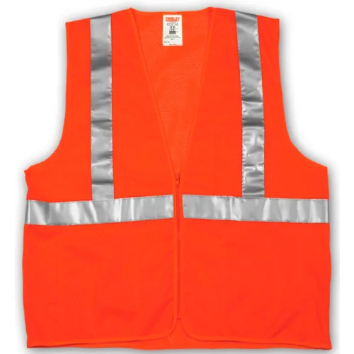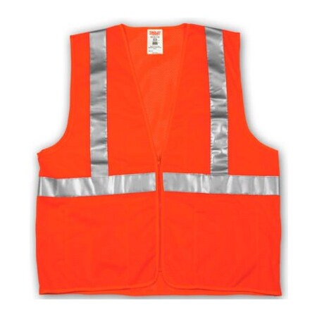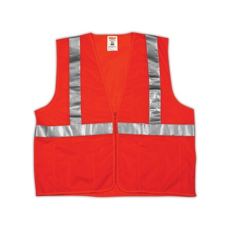 Orange, polyester mesh; 2" silver reflective tape; zipper closure; 4 interior pockets; Meets ANSI/ISEA 107 Class 2 standard.