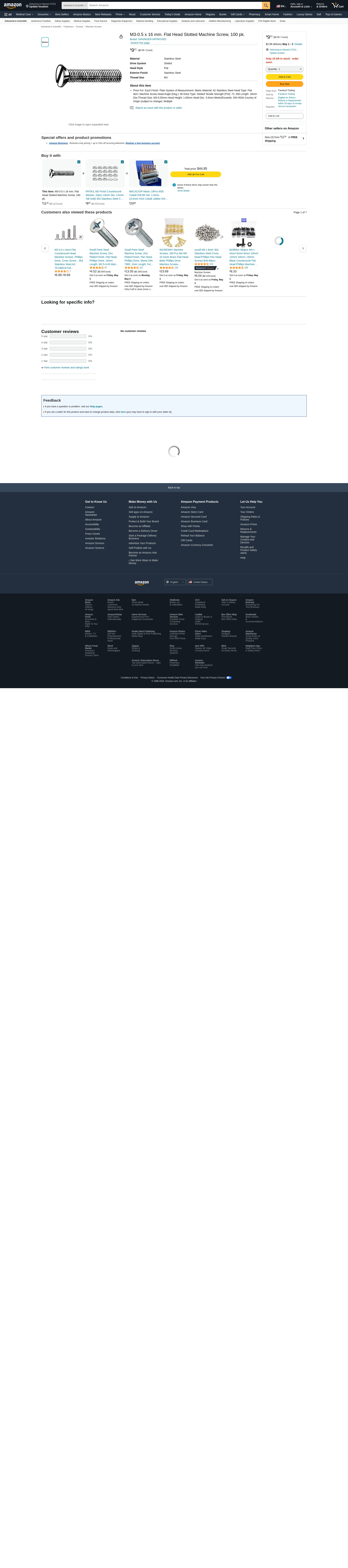 | Feature | Price For: Each Finish: Plain System of Measurement: Metric Material: A2 Stainless Steel Head Type: Flat Item: Machine Screw Head Angle (Deg.): 90 Drive Type: Slotted Tensile Strength (PSI): 72, 500 Length: 16mm Dia./Thread Size: M3-0.50mm Head Height: 1.65mm Head Dia.: 5.6mm Meets/Exceeds: DIN 963A Country of Origin (subject to change): Multiple |
