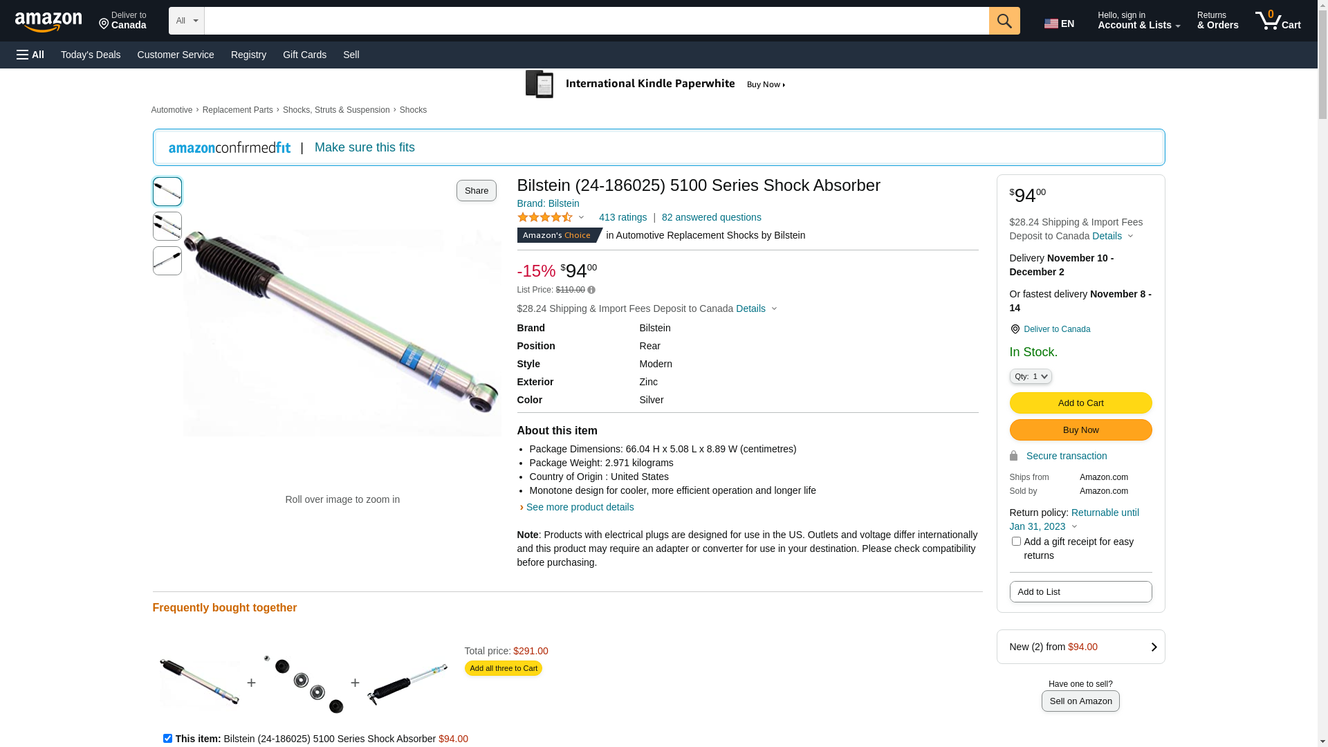![]() automotivestuff.com | BILSTEIN-24-186025 | 1 | -2 | 1 | 1 @ $111.60 |