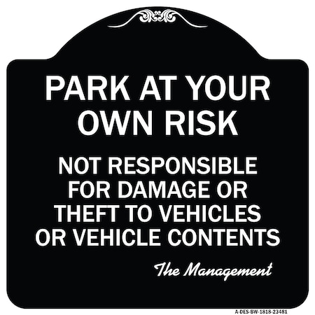 Park at Your Own Risk Not Responsible for Damage or Theft to Vehicles or Vehicle Cont Aluminum Sign