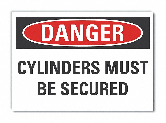 Cylinder Handling Danger Label, Horizontal Rectangle, Number of Printed Sides 1, English, Sign Format Traditional OSHA, Sign Legend Cylinders Must Be Secured, Sign Legend Background Color White, Sign Legend Style Text