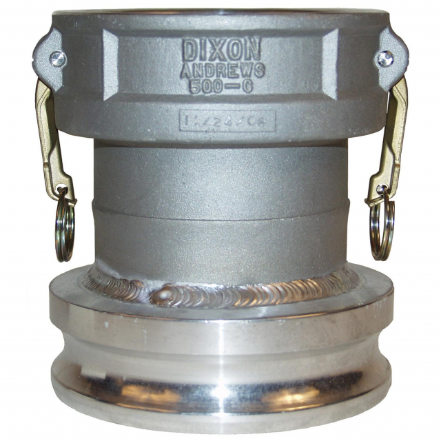 Dixon, 5060-DA-AL, Cam and Groove Reducing Coupler x Adapter (Type DA) Applications Designed for use with liquids Specifications Produced to interchange with all product produced to Commercial Item Description A-A-59326D Construction Buna-N gasket Produced as a welded fabrication How it works To make a connection, simply slide the adapter into the coupler and with normal hand pressure, press the cam levers down. Uncoupling is as quick and simple as coupling. Just lift the cam arms and remove the adapter. Note In reducing couplings, the coupler is the first size in the part number. Safety notes Under no circumstances should cam and groove couplings be used for compressed air or steam service! Pressure rating recommendations are based on the use of mating Dixon fittings at ambient temperature 70 degree F with a standard seal installed.