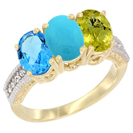 14K Yellow Gold Natural Swiss Blue Topaz, Turquoise & Lemon Quartz Ring 3-Stone 7x5 mm Oval Diamond Accent, sizes 5 - 10