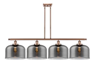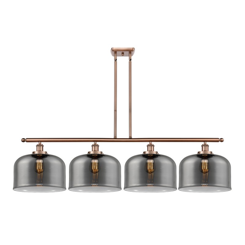 INNOVATIONS LIGHTING 916-4I-AC-G73-L-LED X-Large Bell 3 Light Island Light part of the Ballston Collection. Collection: Ballston. Metal Finish (Body): Antique Copper. Metal Finish (Canopy/Backplate): Antique Copper. Glass or Metal Shade Color: Plated Smoke. Material: Steel, Cast Brass, Glass. Shade Material: Glass. Dimension(in): 10(H) x 48(W) x 8(Ext). Canopy Dimension(in): 6(L) x 4.5(W) x 0.75(H). Min/Max Height(With Shade, Cord or Included Stems & Canopy)(in): 20.375/44.375. Wire/Cord: 10 Feet Of Wire. Shade Size(in): 7.875(H) x 12(Dia). Bulb: (4) 3.5 Watt LED Vintage Medium Base Bulb Included. Voltage: 120. Dimmable: Yes. Color Temperature(Kelvin): 2700. CRI: 82. Lumens: 350. Sloped Ceiling Compatible: Yes. Glass Type: Frosted. Glass or Metal Shade Shape: Sphere. Shade Fitter Measurement: Neckless with a 2.125 inch Hole. Style: Industrial, Modern Contempo, Restoration-Vintage, Transitional . Ul Certification Type: Damp Location. Warranty: 2 Year Finish, Lifetime Electrical.
