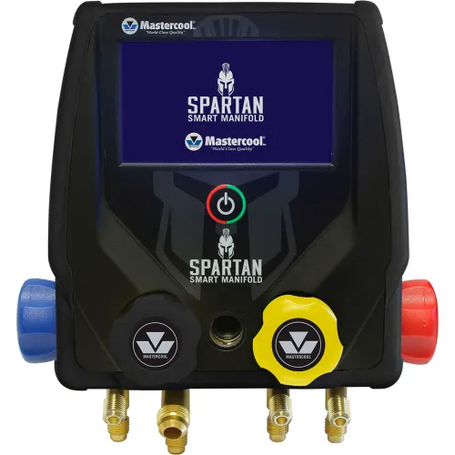Mastercool 99943-BT-2 - SPARTAN Smart Manifold (4 Way, with Two Clamps) 4 way manifold Includes two Temperature Clamps Without hoses Displays pressure, vacuum, and temperature, and will automatically calculate superheat and subcooling 4.3 color touchscreen provides easy navigation with the touch of a fingerMastercool introduces the new SPARTAN series smart manifold with Bluetooth wireless technology. This smart manifold is equipped with a 4 color touchscreen LCD, allowing the user to navigate through all of the screens and options with a quick slide of their finger. Now with a built-in premium vacuum sensor and an accuracy down to 1 micron, there is no need for additional equipment to properly diagnose and service your A/C system.Offered in 2 way and 4 way options, this manifold will display pressure, vacuum, temperature, and will automatically calculate your superheat and subcool. Both models include data logging and will offer additional features such as leak test timers and alarms but that's not all! In conjunction with this manifold will be the ability to download our free Mastercool Connect app, which will provide full mobility as activity can be easily viewed on all compatible hand-held devices. This will allow for endless amounts of data collection and diagnostics at your fingertips.Several versions availableMastercool offers several versions of its SPARTAN manifold. These are built as either 2 or 4 way, and come with a variety of accessories including temperature clamps, and refrigerant and vacuum hoses. The chart below provides an overview of each:Mastercool Connect AppThe Mastercool Connect App is available for free on both the App Store and Google Play.Simply download the free Mastercool Connect app to begin receiving and analyzing data from any nearby Mastercool Spartan Smart Manifold.Use the Spartan Smart Manifold and the Mastercool Connect App to