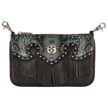 Harley-Davidson Women's Snake Charmer Hip Bag w/ Strap, HDWBA11284-BLK. Durable, heavy-duty polished nickel snap hooks. Constructed from durable genuine leather with gorgeous synthetic snake trim. Decorated with a H-D medallion and embellished studded detailing. Adorable leather fringe for an added touch of style. Complete with a polished nickle finish. Both adorable and functional, this hip bag pouch gives you plenty of room for all of your must-haves with the bonus of an adjustable detachable strap. Size: 8" x 5" x 1". HDWBA11284-BLK <p></p> <ul> <li>Harley-Davidson Women's Snake Charmer Hip Bag w/ Strap</li> <li>Constructed from durable genuine leather with gorgeous synthetic snake trim</li> <li>Polished Nickel Finish</li> <li>Adjustable and detachable strap</li> <li>Size: 8" x 5" x 1"</li> </ul>