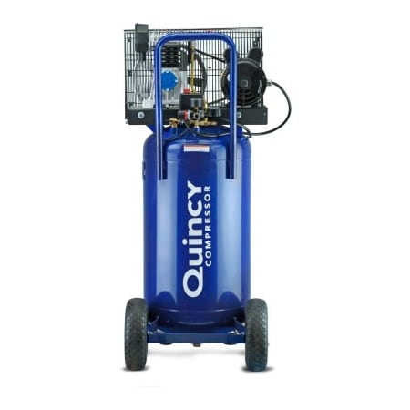 Move between jobsites and free up your workspace with the superior air delivery of a vertical and portable single-stage electric air compressor. Equipped with solid rubber wheels for smooth transport, this compressor is ideal for shops, garages, and light commercial use. With its industry-leading 10,000+ pump life and durable cast iron features, this reciprocating compressor stays cool, extending its lifetime while also reducing noise and wear. <BR><BR> <li>145 PSI max pressure (Delivers 8.3 CFM @ 40 PSI; 7.1 CFM @ 100 PSI)</li> <li>Cut In / Out pressures 115/145 (PSI)</li> <li>Fully enclosed metal belt guard</li> <li>1/4" outlet</li> <li>Oil lubricated</li> <BR>The compressor does the thinking for you, with an automatic start-stop pressure switch and an easy-to-read pressure regulator for adjustable and consistent air pressure. Plus, maintenance is a breeze with an easy-access drain. 1 Year Limited Warranty. Measures 21.5" L x 22" W x 48" H. Must register online: Quincy Part #: 1129740226; Quincy Model #: Q12124PQ.