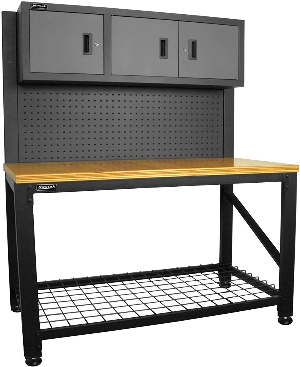 Homak GS00659031 59-Inch Wood Top Workbench with 3 Door Cabinet, Steel | JB Tools