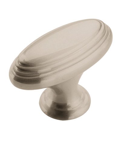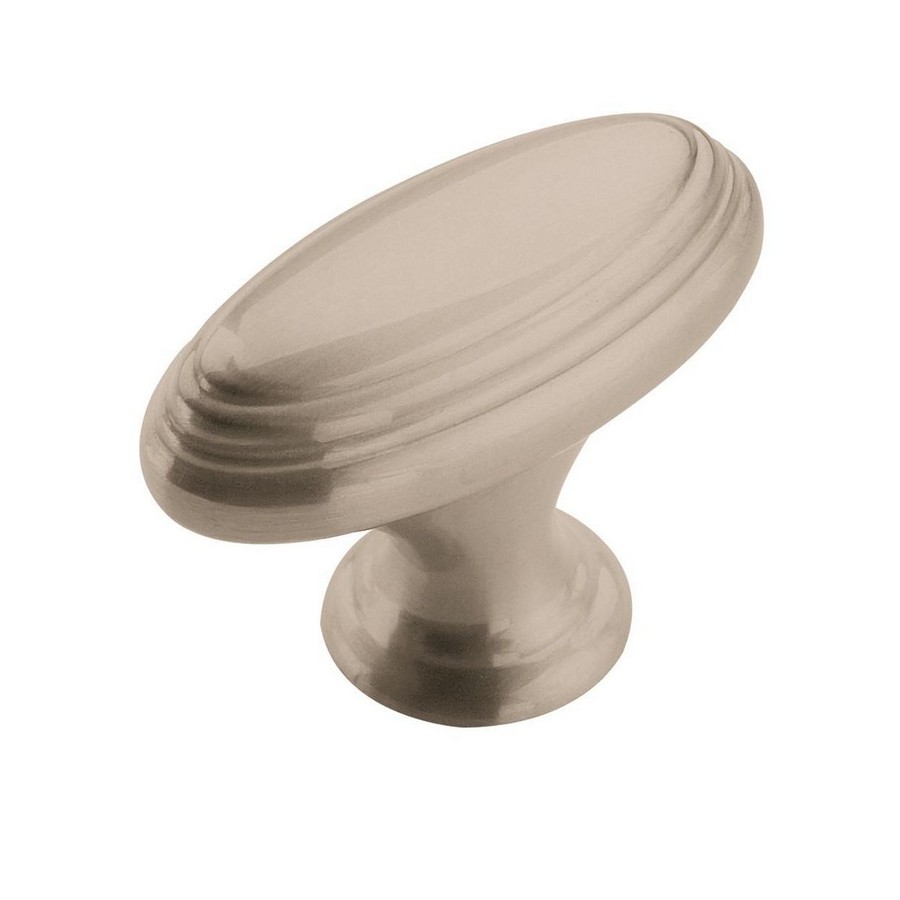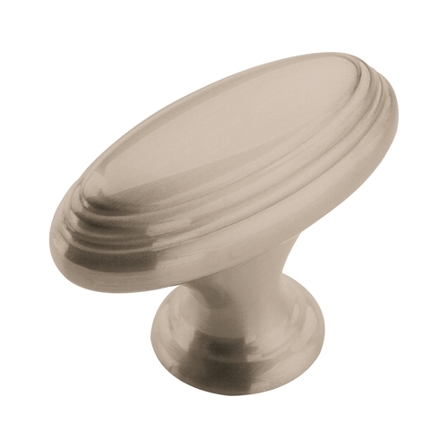 Set of 10. Amerock Mulholland Knob. 1-7/16 in. Length. Satin Nickel. Lifetime Finish. 1 4/9 in. L x 2/3 in. W x 1 in. H (0.18 lbs).
