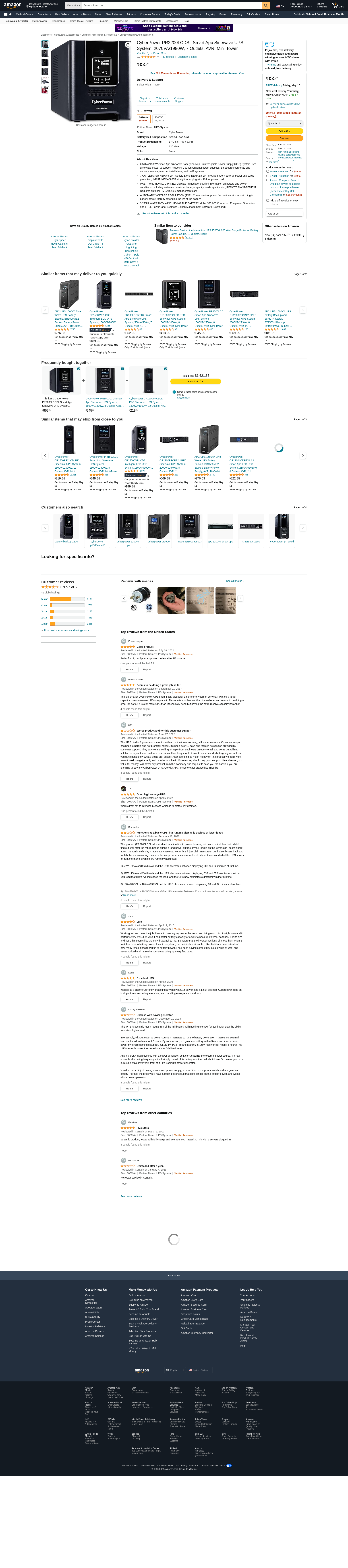 CyberPower PR2200LCDSL Smart App Sinewave UPS System, 2070VA/1980W, 7 Outlets, AVR, Mini-Tower