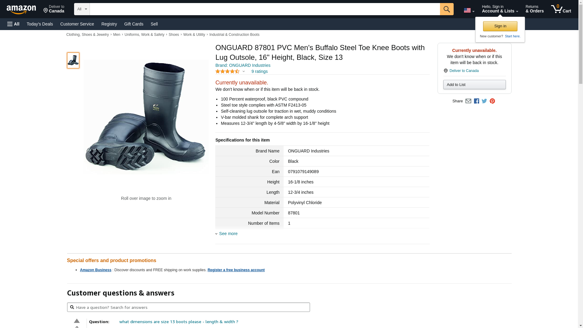 Onguard Buffalo 87801 Black 13 Waterproof & Rain Boots - 16 in Height - PVC Upper, PVC Sole and Steel Toe Cap - 791079-14908 [PRICE is per PAIR]