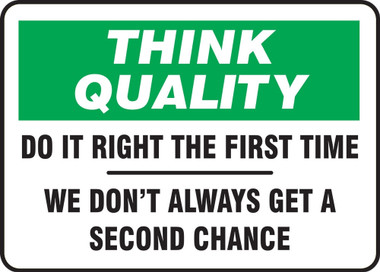 Accuform MQTL735VP Plastic Sign, Think Quality DO IT Right The First TIME WE Don't Always GET A Second", 10" Length x 14" Width x 0.055" Thickness, Green/Black on White