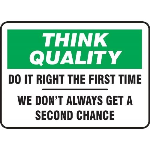 Accuform, MQTL735VP, 10" x 14" Safety Sign "Do It Right The First Time - We Don't Always Get A Second Chance" Plastic Features: Manufactured with 50% Post-Consumer Recycled plastic and is recyclable code 2 .055" thick polyethylene, matte surface print Impact resistant with slight flexibility Rounded corners and 3/16" mounting holes on most sizes, will be adjusted for larger sizes Service temperature range: -90 F to 168
