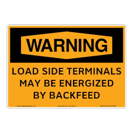 <p><strong>Word Message: </strong><br />LOAD SIDE TERMINALS MAY BE ENERGIZED BY BACKFEED</p><p><strong>Description: </strong><br />Clarion Safety Systems brings you Warning Load Side Terminals May Be Energized by Backfeed safety signs (OS1173WH-) which are produced on premium plastic or aluminum material and are designed to meet your OSHA safety sign needs.<p><strong>Material Information:</strong></p> <ul> <li><strong>Material</strong>: (Z1) Outdoor Flexible Polyester</li> <li><strong>Base Materials</strong>: 3M .002 premium white polyester</li> <li><strong>Overlaminate</strong>: 3M .003 ultra-clear weatherable UV resistant</li> <li><strong>Mounting Option</strong>: 3M Premium Structured Acrylic</li> <li><strong>Application</strong>: Indoor/Outdoor</li> <li><strong>MaxTemp</strong> (F): 175</li> <li><strong>MinTemp</strong> (F): -40</li> <li><strong>Chemical Resistance</strong>: Excellent</li> <li><strong>UV Resistance</strong>: Excellent </li> <li><strong>Outdoor durability</strong>: Excellent</li> <li><strong>Storage Stability</strong>: Stable. Optimum storage conditions: 72 F @ 50% relative humidity</li> <li><strong>Expected Life Indoor</strong>: Long term</li> <li><strong>Expected Life Outdoor</strong>: 5 years plus (expected outdoor life may vary due to climatic conditions)</li> <li><strong>RoHS</strong>: Yes</li> <li><strong>CRoHS</strong>: Yes</li> <li><strong>REACH</strong>: Yes</li> </ul>