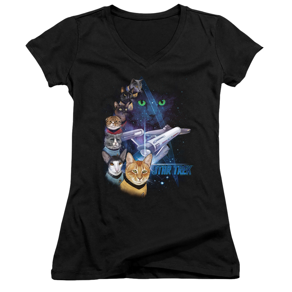 Trevco CBS2549-JV-3 Star Trek & Feline Galaxy Juniors Sheer Cap Sleeve V-Neck T-Shirt, Black - Large