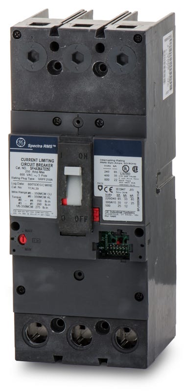 GE SFHA36AT0250 digital solid state rms trip; 600 vac (ul/csa), 690 vac (iec); 250 ampere (ul/csa, iec); 3 pole; interrupting rating 35 kiloampere at 480 vac; approval ce; spectra rms[t] brand; sfha model