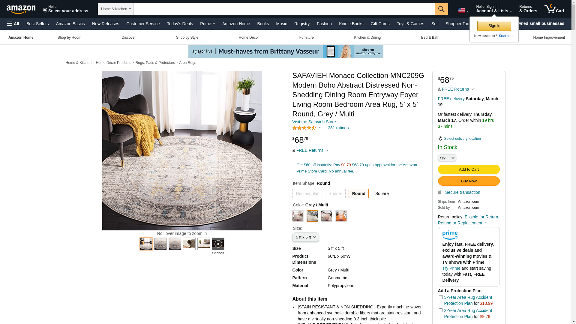Safavieh MNC209G-5R Monaco Power Loomed Round Area Rug, Grey & Multi Color- 5 x 5 ft.
