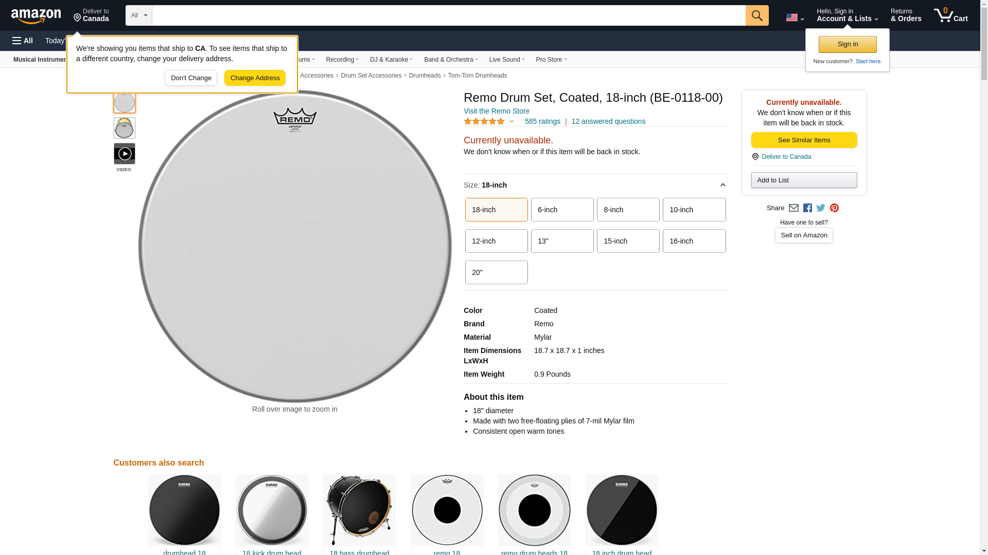 Remo Drum Set, Coated, 18-inch (BE-0118-00)