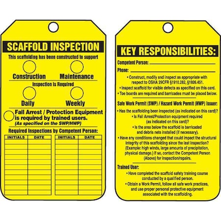 Accuform Signs TRS318CTP Scaffold Status Tag, Legend"Scaffold Inspection (Checklist)/Key Responsibilities", 5.75" Length x 3.25" Width x 0.010" Thickness, PF-Cardstock, Black on Yellow (Pack of 25)