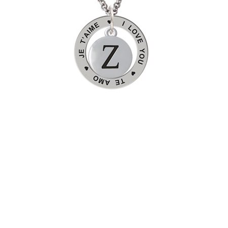 Capital Letter - Z - Pebble Disc - I Love You Je T'aime Te Amo Affirmation Ring Necklace. Charm. Charm size is approx. 0.59 x 0.50 x 0.09 inches (HxWxD) including loop. Silver tone 2mm Belcher Chain Necklace is approx. 24 Inches with a Lobster Claw Clasp. Affirmation Ring is approx. 0.86 x 0.86 x 0.05 (HxWxD). This inspirational piece of jewelry is very meaningful. Its circular shape is symbolic for endless belief in the message that is imprinted around the ring. These are motivational or sentimental messages to the wearer. Perfect gift for that precious woman in your life. Tell her how much you care. PLEASE NOTE: Our products are lead safe, but are not intended for children 14 years and younger.