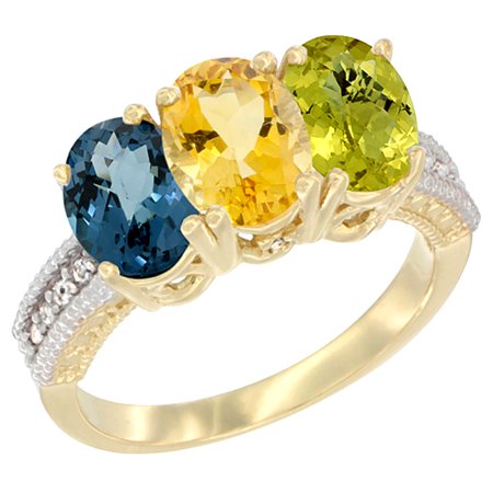 10K Yellow Gold Diamond Natural London Blue Topaz, Citrine & Lemon Quartz Ring 3-Stone Oval 7x5 mm, sizes 5 - 10
