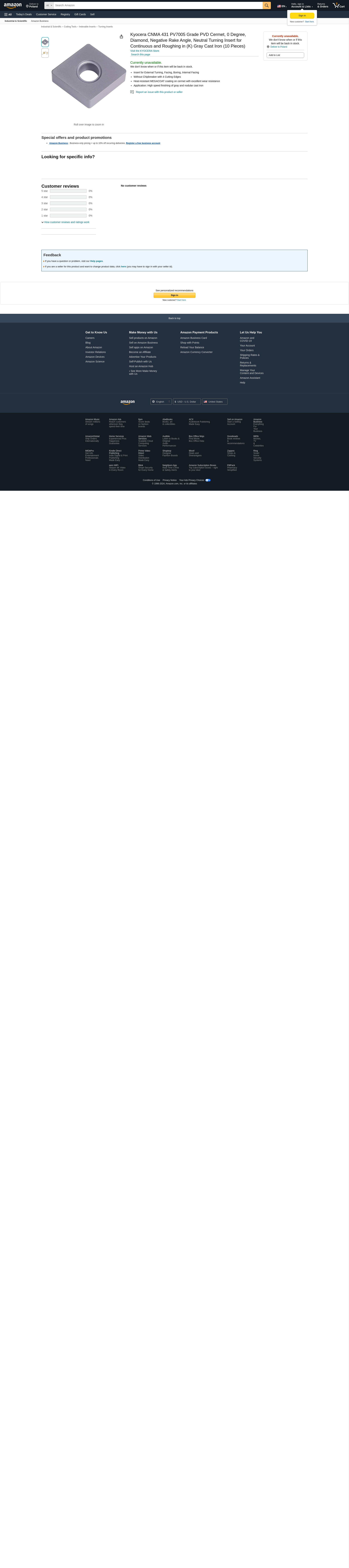 Kyocera CNMA 431 PV7005 Grade PVD Cermet, 0 Degree, Diamond, Negative Rake Angle, Neutral Turning Insert for Continuous and Roughing in (K) Gray Cast Iron (10 Pieces)