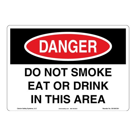 <p><strong>Word Message: </strong><br />DO NOT SMOKE EAT OR DRINK IN THIS AREA</p><p><strong>Description: </strong><br />Clarion Safety Systems brings you Danger Do Not Smoke Eat or Drink in This Area safety signs (OS1081DH-) which are produced on premium plastic or aluminum material and are designed to meet your OSHA safety sign needs.<p><strong>Material Information:</strong></p> <ul> <li><strong>Material</strong>: (BJ) Indoor/Outdoor Plastic</li> <li><strong>Base Materials</strong>: .060" Rigid White Plastic</li> <li><strong>Overlaminate</strong>: none</li> <li><strong>Mounting Option</strong>: Mounting holes</li> <li><strong>Application</strong>: Indoor/Outdoor</li> <li><strong>MaxTemp</strong> (F): 140</li> <li><strong>MinTemp</strong> (F): 32</li> <li><strong>Chemical Resistance</strong>: Good</li> <li><strong>UV Resistance</strong>: Good</li> <li><strong>Outdoor durability</strong>: Good</li> <li><strong>Storage Stability</strong>: Stable. Optimum storage conditions: 72 F @ 50% relative humidity</li> <li><strong>Expected Life Indoor</strong>: Long term</li> <li><strong>Expected Life Outdoor</strong>: 3-5 year (expected outdoor life may vary due to climatic conditions)</li> <li><strong>RoHS</strong>: Yes</li> <li><strong>CRoHS</strong>: Yes</li> <li><strong>REACH</strong>: Yes</li> </ul>