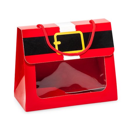 <ul> <li>Gourmet window gift boxes have rope cord handles and are printed in the interior of the box. The small boxes have 7" rope handles for easy carrying, and a 2 x 3-3/4" acetate window in the front. Hook and loop closures hold the die cut fold over flap closed. The large boxes have 8-1/2" rope handles, and a 2-3/4 x 5" acetate window in the front. These boxes make a perfect presentation for your gourmet products.</li> <li>Dimensions and weights subject to modest variance. Large Santa's Belt Gourmet Window Totes have rope handles and clear acetate windows.</li> </ul>