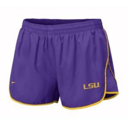 100% polyester NikeFIT woven microfiber Lsu Tigers short with contrast curving design lines and low-rise construction. Mesh side insets provide ventilation and full range of motion. Elastic waistband with internal drawcord allows for a custom fit. Built in NikeFIT crepe liner and internal key pocket. Screen printed LSU at left hem and Nike swoosh at right hem. PLEASE NOTE: Nike woman's clothing is junior sizing.