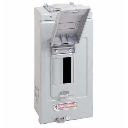 Rainproof galvanized steel enclosure. Single phase 3 wire insulated/bondable movable neutral 2 (1") spaces 4 poles 120/240 volt AC. With closure plates hubs and No.GBK5 or GBK520 ground bar kits (necessary for sub-feeding) sold separately. Tin-plated aluminum bus bar. In accordance with NEC suitable for use as service equipment when not more than 2 service disconnecting mains are provided or when not used as a lighting and appliance panelboard. When bonded unused neutral connections may be used for equipment ground protectors in service entrance application. #8 - #2 wire range. Electrostatic powder coat baked urethane painted. 4-1/2" x 9-7/16" x 3". UL Listed file E8741. Style 5R box.