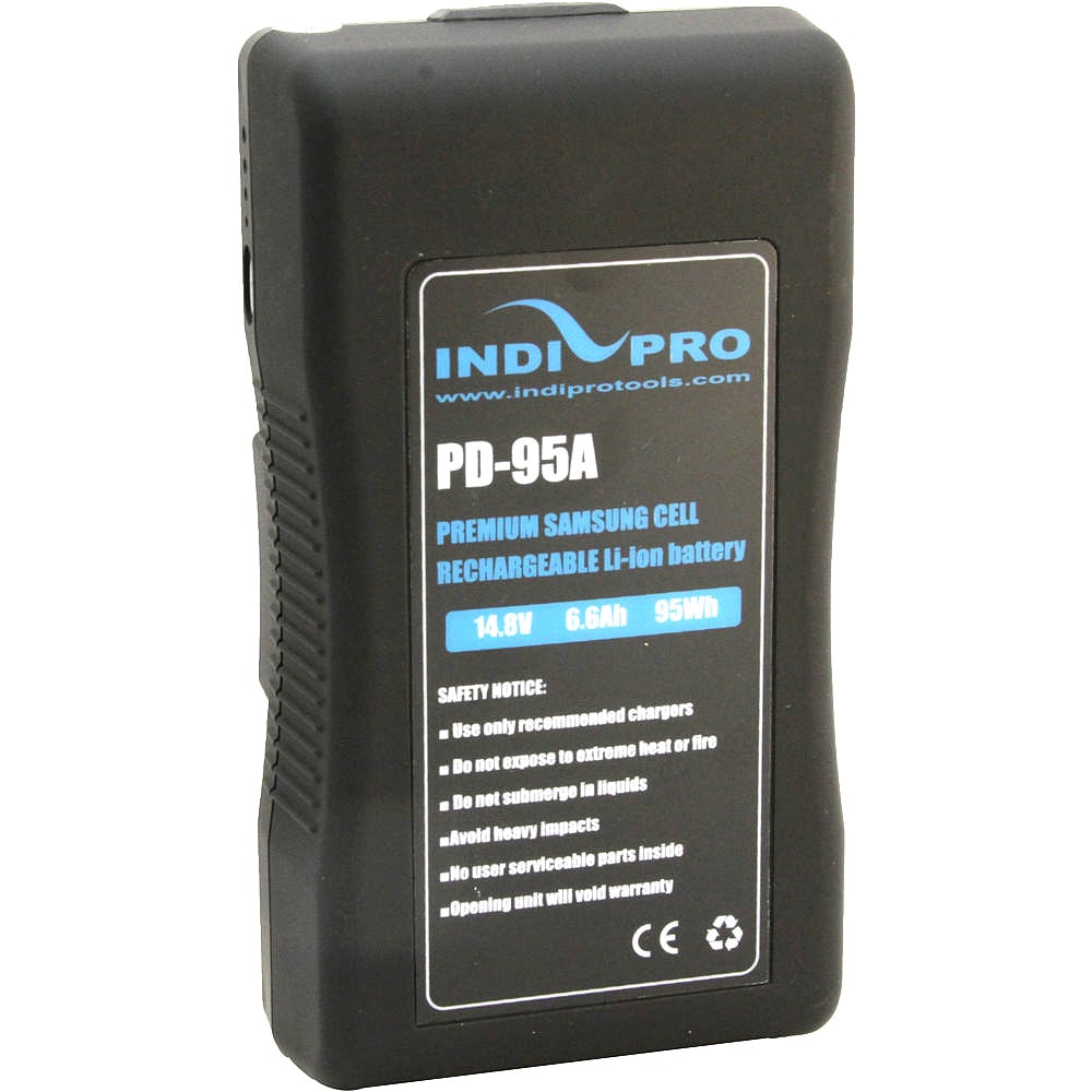 Compact 95Wh GoldMount LiIon Battery Containing a premium Samsung battery cell the IndiPRO Tools Compact 95Wh GoldMount LiIon Battery outputs 148V and has a 95Wh capacity The battery incorporates a standard Goldmount for a secure connection to Goldmount accessories and chargers A builtin 4segment battery gauge LED display provides readout of the remaining battery power The battery features an industry standard DTap that allows you to power accessories using additional cables Features. For powering cameras lights and monitors . Offers 148V output with 95Wh capacity . Builtin 4segment LED battery indicator shows remaining power . Goldmount system provides secure lockable mounting and compatibility with other Goldmount accessories and chargers . 2pin DTap gives you the flexibility to power accessories directly from the batterySpecifications. Voltage 148 V . Power Watt Hours 95. Amp Hours 66 . Mount Goldmount . Dimensions H x W x D 64 x 35 x 20 162 x 89 x 51 cm . Weight 16 lb 07 kg Warranty. Limited 2Year Warranty