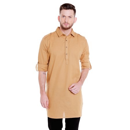 <ul> <li>Thigh length classic kurta tunic; Pathani Style with roll-up sleeves and shoulder strap</li> <li>The model is 6" tall, with chest measurement of 39 inches. He is wearing size "Medium" in the display photo</li> <li>Machine wash with cold water on delicate cycle; hang dry</li> <li>Ethically made in India</li> <li>Stocked and Shipped locally from the US.</li> </ul>