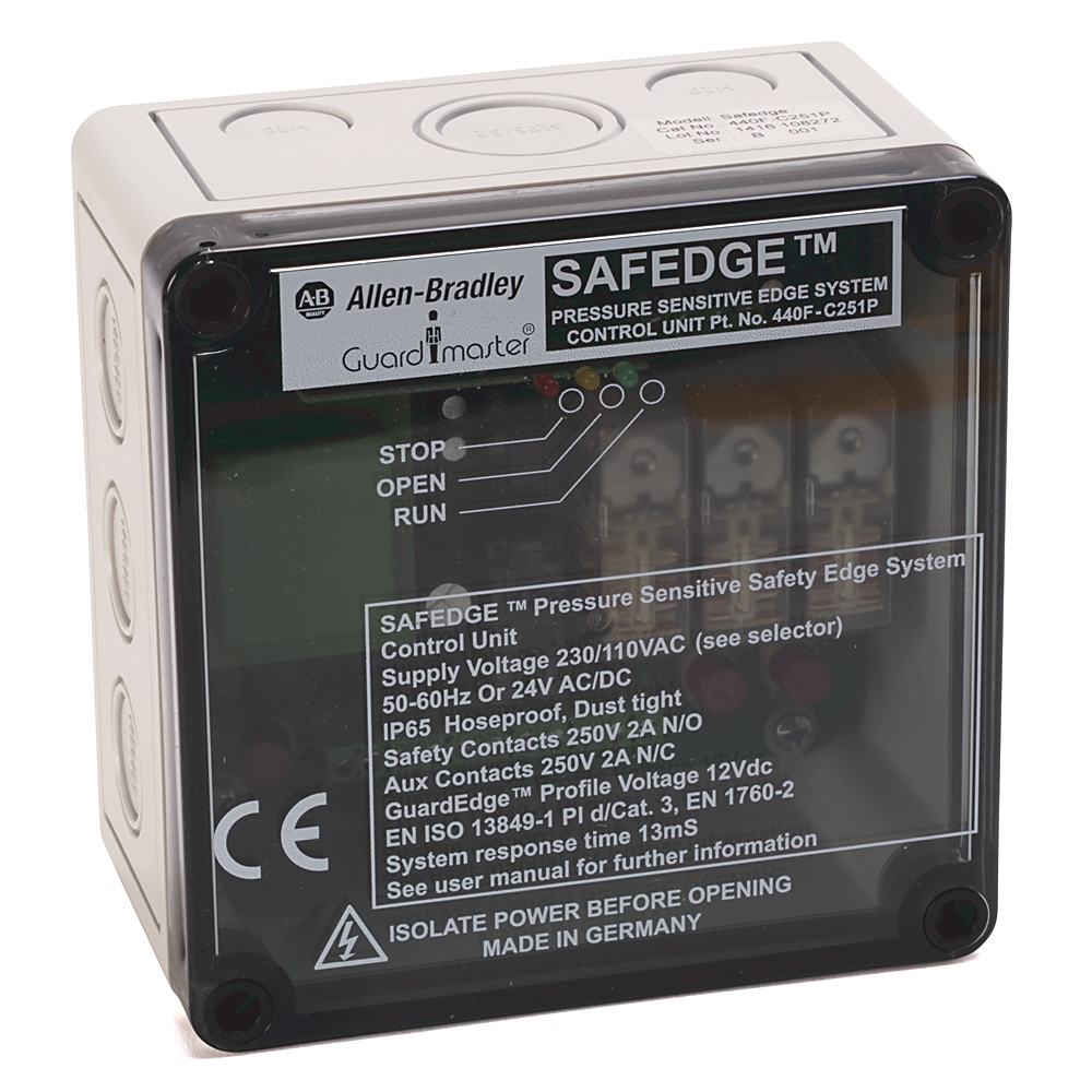PN: 440F-C251P <br />440FC251P <br /><br />Aux. Contacts: 250V 2A N/CGuardEdge Profile Voltage: 12VdcSafety Contacts: 250V 2A N/OSupply Voltage: 230/110VAC (See Selector) 50-60Hz Or 24V AC/DCSystem Response Time: 13mS<br />Pressure Sensitive Edge SystemGuardMasterIP65 Hoseproof; Dust TightEN 954-1 Category 3, prEN 1760-23 Wire Leads (2) W/4 Pin/F Connector <br /> <br /><br />Series B <br />