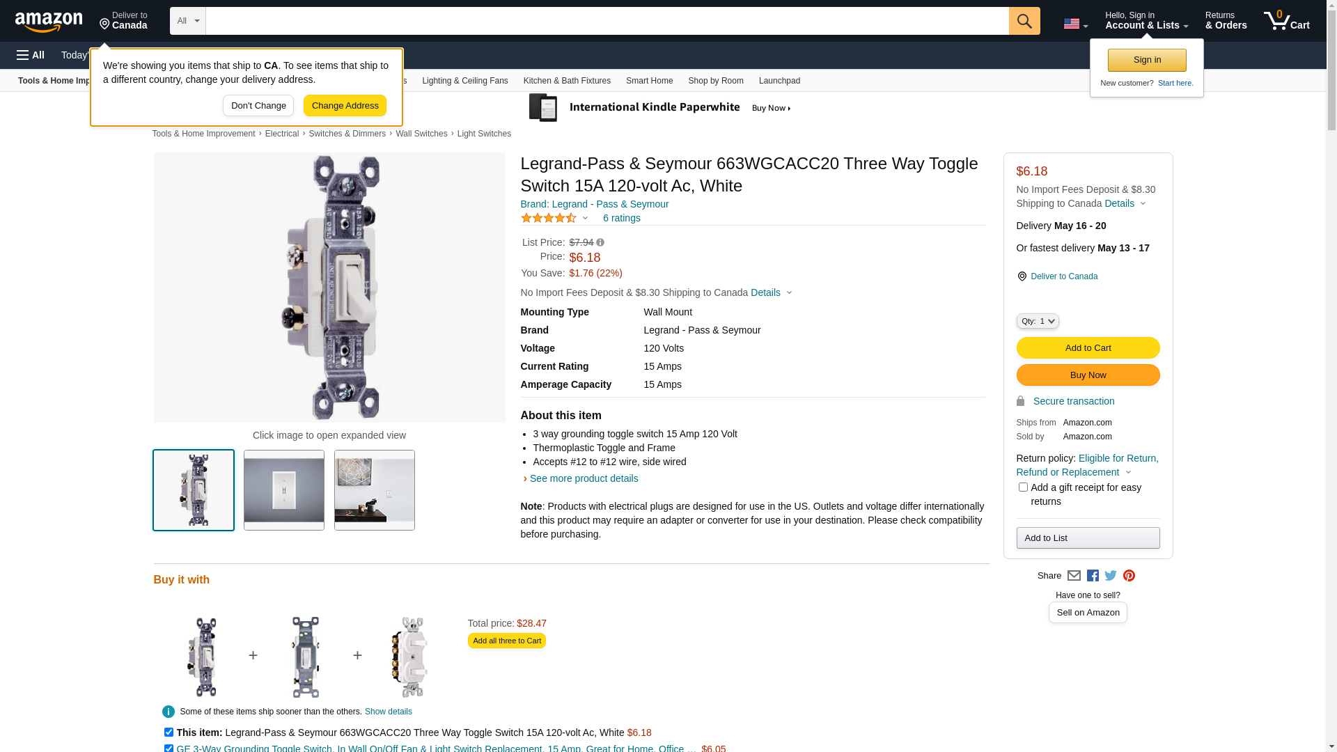 Legrand-Pass & Seymour 663WGCACC20 Three Way Toggle Switch 15A 120-volt Ac, White