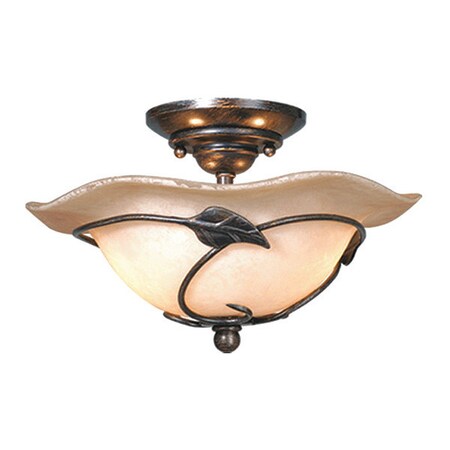 Bring a little of the outdoors inside with the Vine collection. Inspired by nature, this rustic collection features a dark oil shale finish. The amber flake glass shades are scalloped softening the overall feel. Elegantly curved arms are sprinkled with delicately crafted leaves completing the look. This full family of fixtures has something for every room in your home. This semi flush mount ceiling light is ideal for hallways, living rooms, bedrooms, entryways or utility rooms. This versatile fixture can be installed two ways; mount as a ceiling fan light kit (check compatibility with your fan) or as a semi flush ceiling light. Pull chain on-off switch or wall switch controlled.