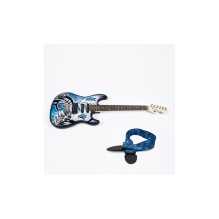 This guitar has Limited edition custom body artwork with a Solid wood body; Maple neck and headstock; Rosewood fingerboard. Includes Single and dual coil pickups for flexible tone; Adjustable bridge; Includes whammy bar. With Guitar stand and black gig bag included; Individually numbered on engraved metal plates in a limited edition series. The guitar strap measures at 2" wide expands from 35"- 60" long. With sublimated team print on durable machine washable 100% polyester; leather ends.