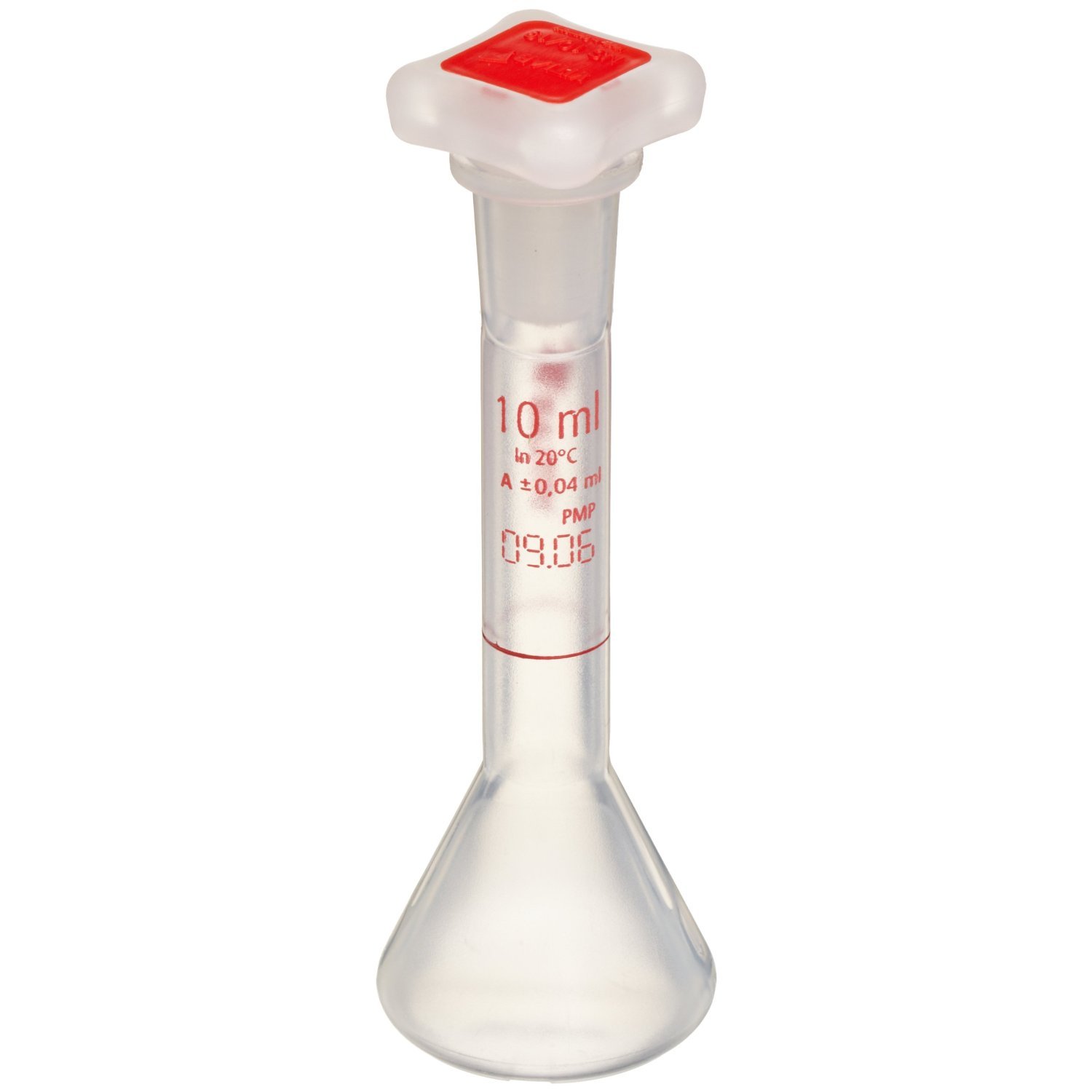 Polymethylpentene clear volumetric flasks are an excellent break-resistant alternative to glass. Class A per DIN EN ISO 1042. Supplied with matching polypropylene standard taper joint stoppers. Sold as Pack of 6.