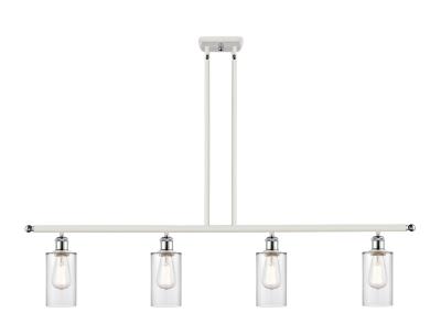 INNOVATIONS LIGHTING 516-4I-WPC-G802-LED Clymer 3 Light Island Light. The Clymer 3 Light Island Light is part of the Ballston Collection. Includes 10 Feet Wire. Includes 2-6 and 4-12 inch Stems With Solid Brass 90 Degree Hang Straight Swivels for Sloped Ceilings. Solid Brass 90 Degree Hang Straight Swivel for Sloped Ceilings Included. Collection: Ballston. Material: Steel, Cast Brass, Glass. Metal Finish(Body): White and Polished Chrome. Metal Finish (Canopy/Backplate): White. Accent Color: Polished Chrome. Dimension(in): 12(H) x 48(W) x 3.875(Ext). Min/Max Height (Fixture Height with Shade, Cord or Included Stems & Canopy)(in): 21.375/45.375. Wire/Cord: 10 Feet Of Wire. Stem: 2-6 and 4-12 inch downrods. Sloped Ceiling Compatible: Yes. Maximum Wattage Per Socket: 100. Bulb: (4)3.5 Watt LED Vintage Medium Base Bulb Included. Dimmable: Yes. Color Temperature(Kelvin): 2700. Lumens: 350. Color Rendering Index(CRI): 82. Voltage: 120. Glass Shade Description: Clear Clymer. Glass Type: Transparent; Ribbed. Glass or Metal Shade Shape: Drum. Glass or Metal Shade Color: Clear. Shade Material: Glass. Shade Size (Diameter x Height)(in): 3.875 X 5.875. Shade Fitter Measurement(in): Neckless with a 1.625 inch Hole. Canopy Dimensions(in): 6 x 4.5 x.75. Certification: UL & ETL, Damp Location. Solid Brass 90 Degree Hang Straight Swivels for Sloped Ceilings Included.